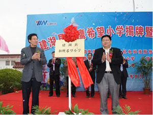 4月1日下午,和鷹科技在江蘇建湖縣開發區鐘莊小學舉行和鷹希望小學揭牌暨集中捐贈儀式。鹽城市團委副書記出席活動并致辭?h委常委、組織部長尹恒斌,上海和鷹機電科技股份有限公司董事長尹智勇共同為建湖縣和鷹小學揭牌。