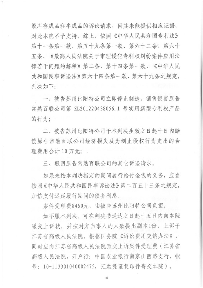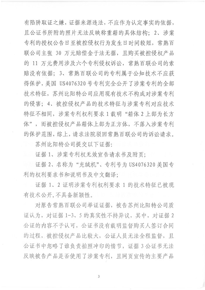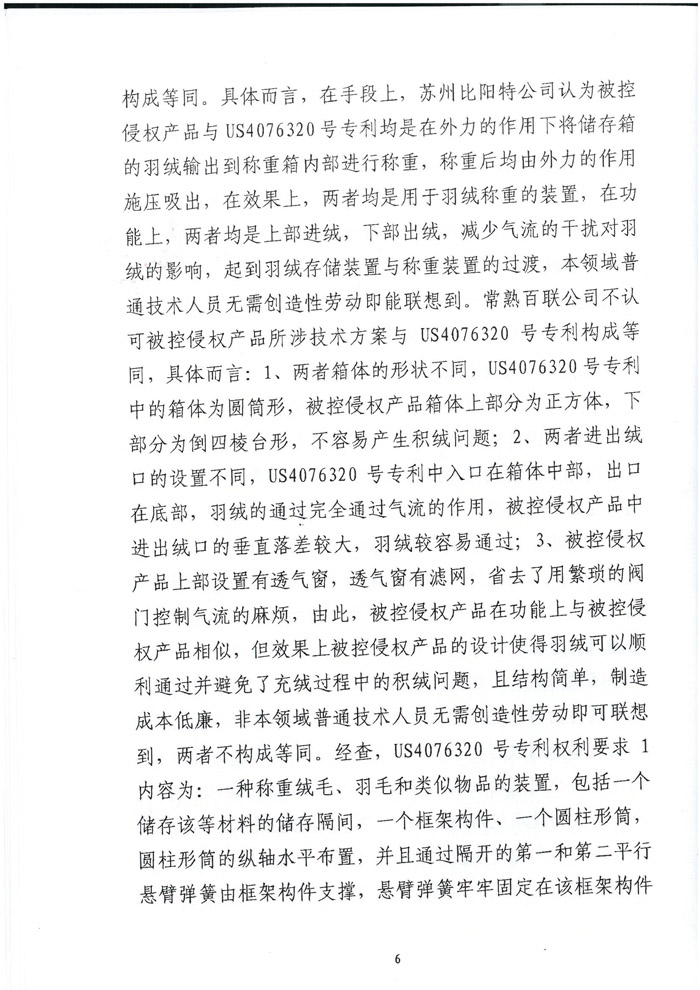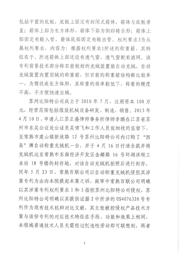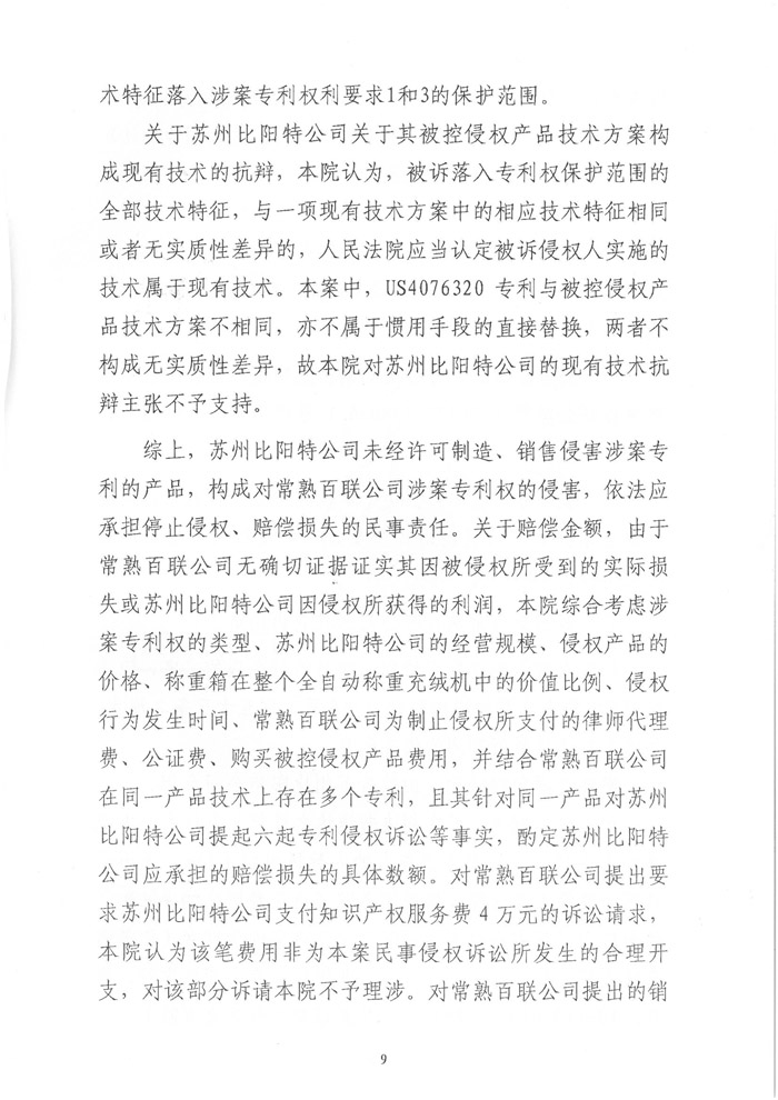 2014年3月19日,江蘇省蘇州市中級人民法院依法做出民事判決{(2013)蘇中知民初字第2014號},判決被告蘇州比陽特服裝設備有限公司立即停止制造、銷售侵害原告常熟百聯公司第ZL201220438056.1號(俗稱“全自動稱重充絨機”)實用新型專利權產品的行為,并賠償原告常熟百聯公司的經濟損失及為制止侵權行為支出的合理費用。