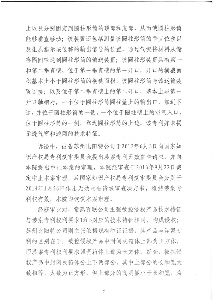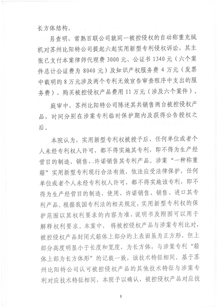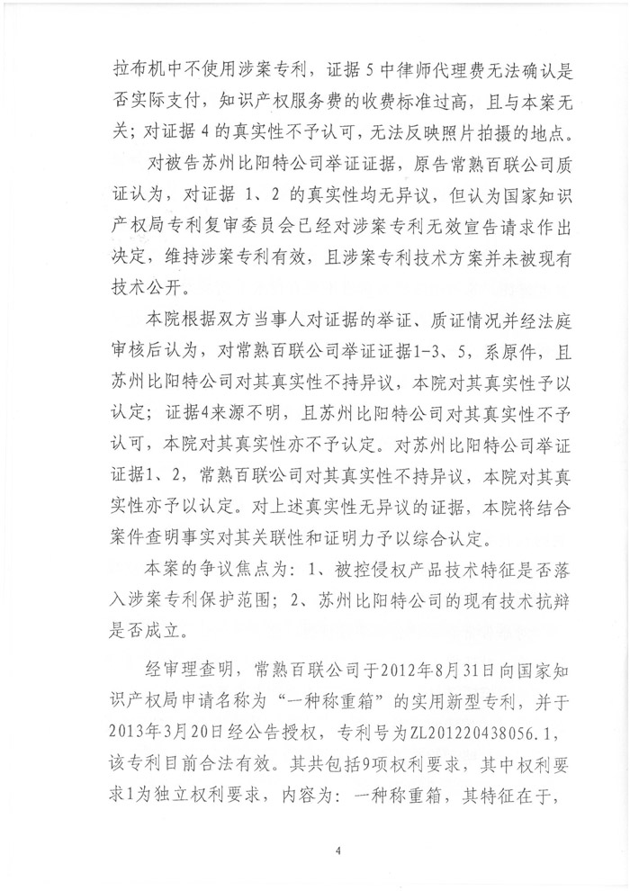 經蘇州市中級人民法院審查后確認,涉案“一種稱重箱”(俗稱“全自動稱重充絨機”)實用新型專利現行合法有效,依法應受法律保護,任何單位或者個人未經專利人許可,都不得實施其專利,即不得為和產經營目的制造、使用、許諾銷售、銷售、進口其專利產品。被控侵權產品對應技術特征落入涉案專利要求1和3保護范圍。蘇州比陽特未經許可制造、銷售侵害涉案專利的產品,構成對常熟百聯公司涉案專利權的侵害,依法應承擔停止侵權賠償損失的民事責任。2014年3月11日,蘇州中級人民法院進行公開審理,3月19日,依照《中華人民共和國專利法》第十一條第一款、第五十九條第一款、第六十二條、第六十五條、《最高人民法院關于審理侵犯專利權糾紛案件應用法律若干問題的解釋》第二條、第十四條第一款,《中華人民共和國民事訴訟法》第六十四條第一款、第六十九條之規定作出“比陽特”侵權成立的判決,下達了(2013)蘇中知民初字第2014號民事判決書。
