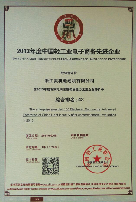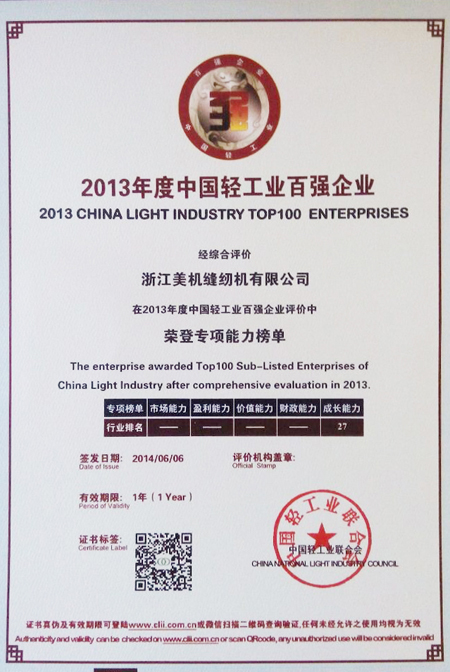 經中國輕工業聯合會對2013年度企業營業收入、利潤總額、營業收入利潤率,稅收占利稅比重及營業收入增速五項指標綜合評分,并經中國輕工業聯合會會長辦公會審定通過,中國美機榮登2013年度中國輕工業成長能力百強企業、2013年度中國輕工業電子商務先進企業榜單。