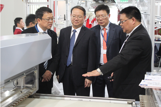 在德國舉辦的展會上,上海和鷹機電科技股份有限公司董事長尹智勇向中國紡織工業聯合會副會長高勇介紹本公司參展的先進設備