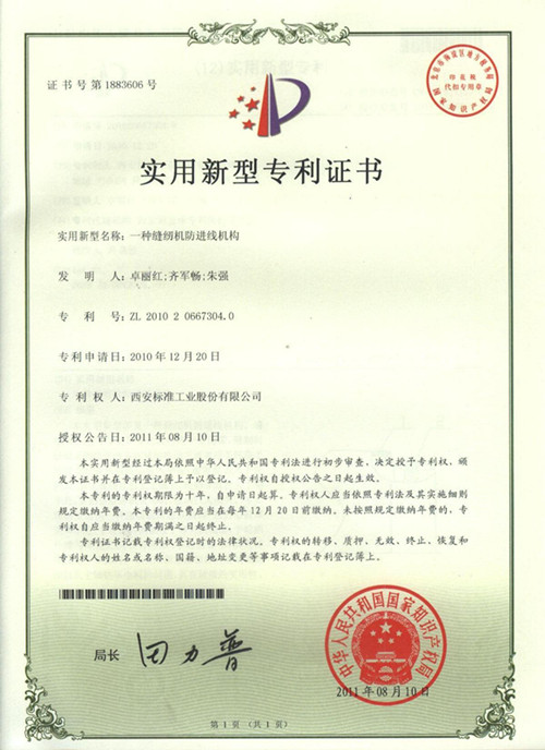 近日,標準公司自主研發的縫紉機防進線機構專利(專利號:ZL 2010 2 0667304.0)獲得2013年度陜西省專利獎三等獎。該專利由技術中心齊軍暢、卓麗紅共同發明。