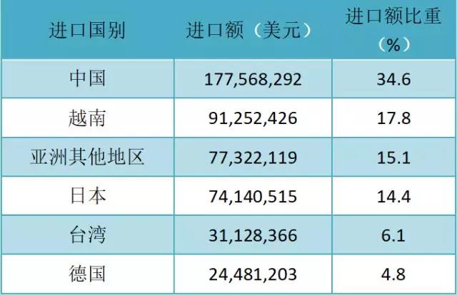 另據(jù)聯(lián)合國聯(lián)合國商品貿(mào)易統(tǒng)計數(shù)據(jù)庫最新數(shù)據(jù)顯示,2016年美國累計進口縫制機械產(chǎn)品(不含刺繡機)5.13億美元,其中從中國進口1.78億美元,占其進口比重的34.6%。其中工業(yè)縫紉機進口45.7萬臺,進口額1.33億美元,從中國進口30.6萬臺,進口額3909萬美元,分別占其比重66.9%,29.3%,進口額僅次于日本。