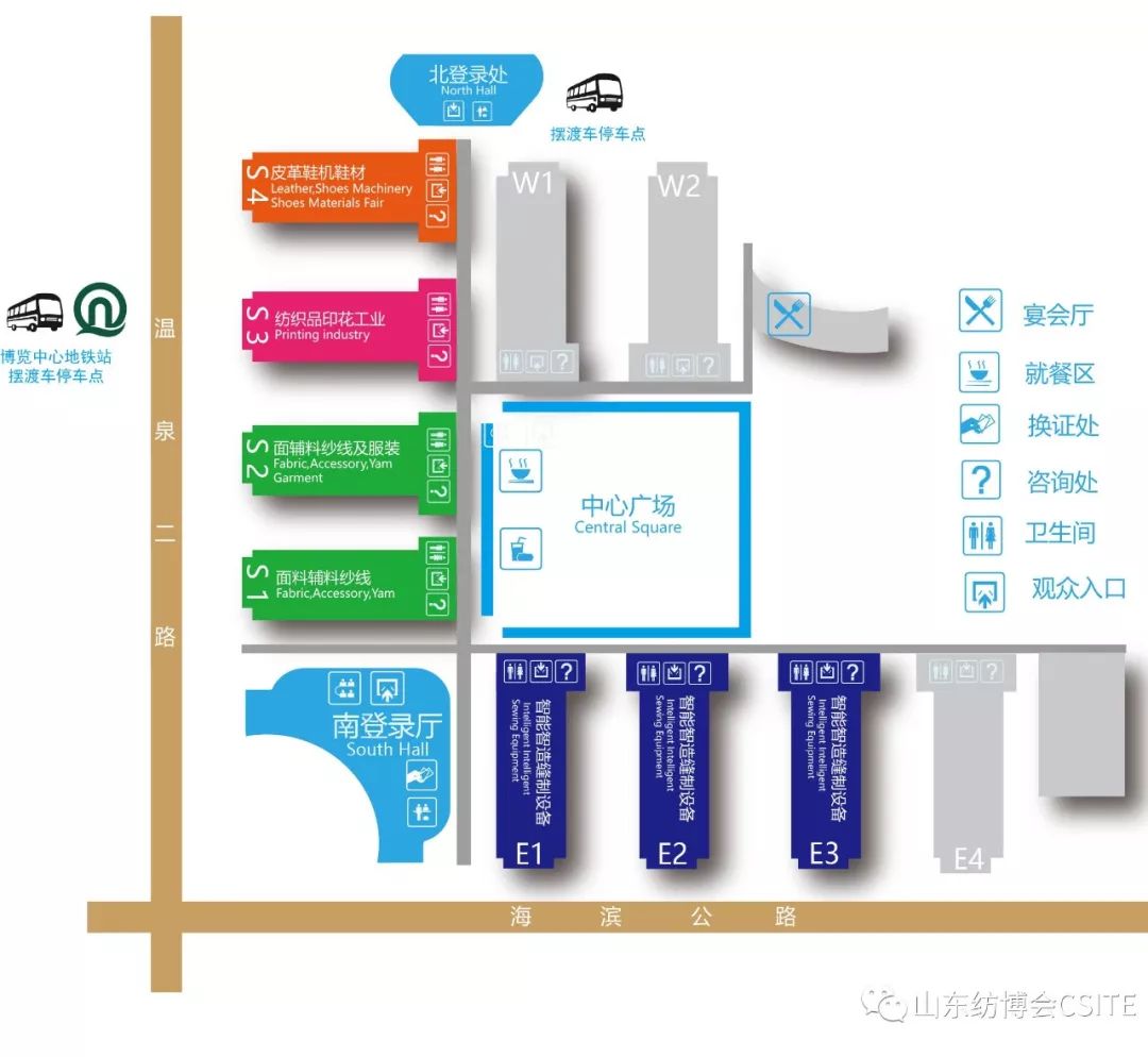 青島國際博覽中心是一個多區的展館。要了解QISMA的布局,首先來看看山東紡博會的分布總圖,主要的設施在圖上都有標識~