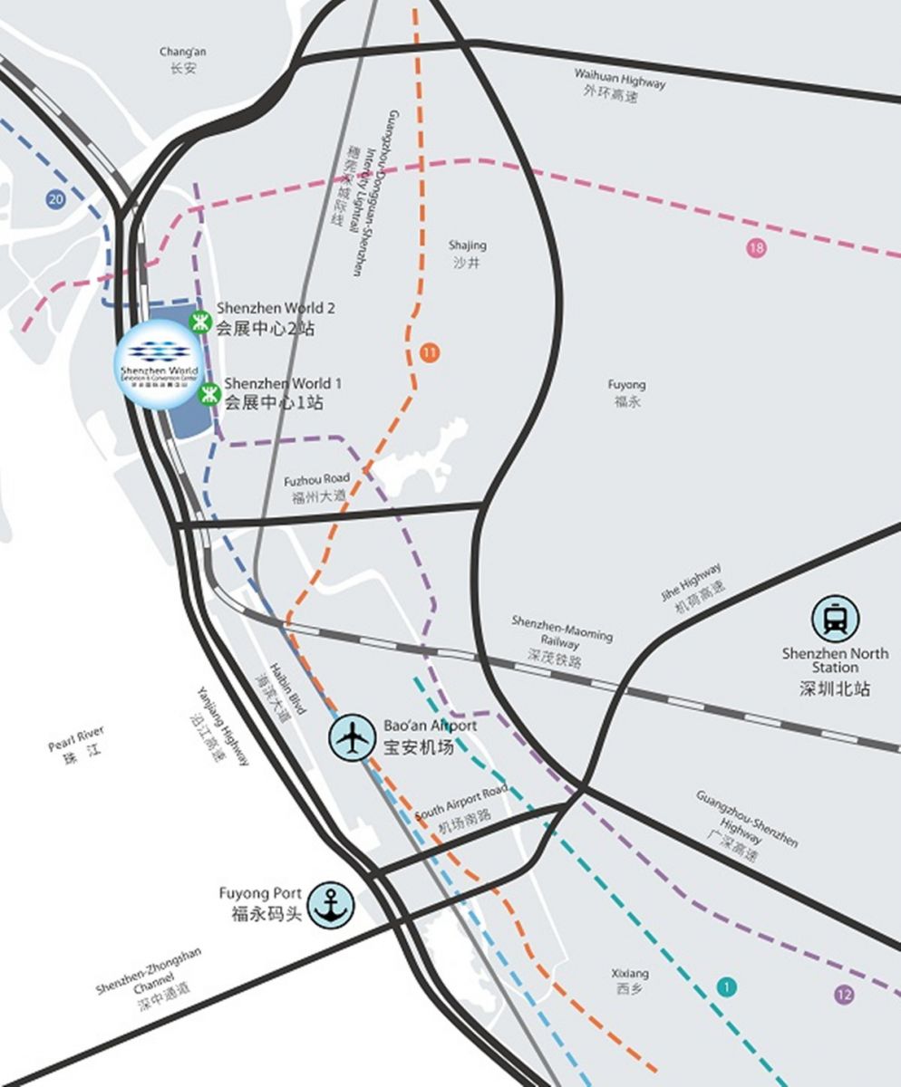 地鐵:地鐵12號與20號線直通展館2個地鐵站(會展南和會展北);20號線從展館2站直達機場,并可與11號線、穗莞深城際線換乘。11號線褔永站和橋頭站距展館3-3.5公里,將配備穿梭巴士。