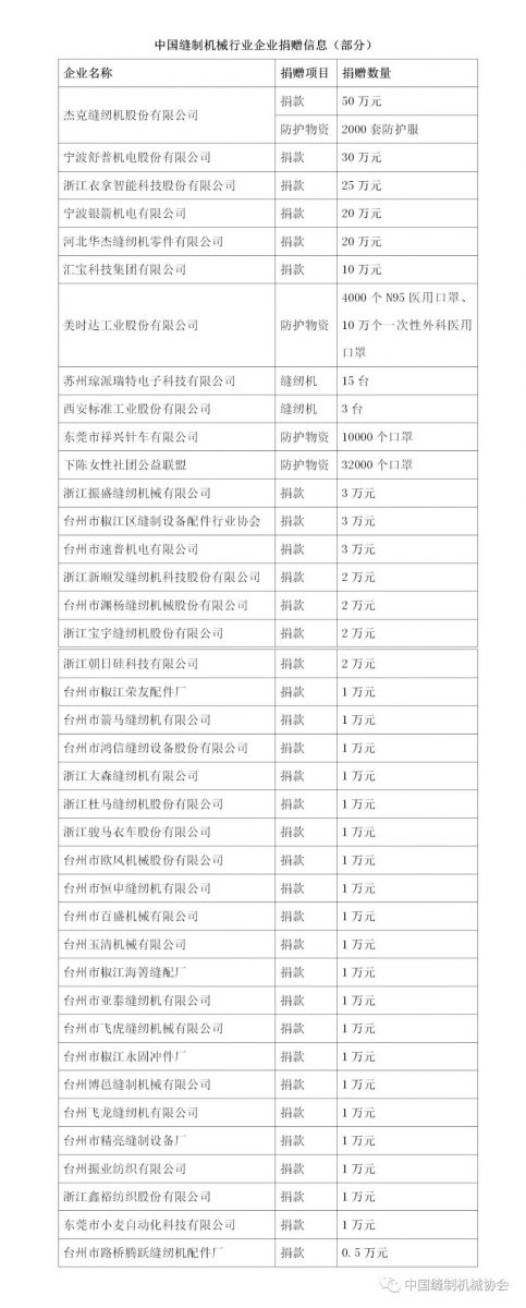自2月10日開(kāi)始,各產(chǎn)業(yè)領(lǐng)域陸續(xù)開(kāi)始復(fù)工復(fù)產(chǎn)。縫制機(jī)械行業(yè)作為保障防護(hù)物資生產(chǎn)的最重要的設(shè)備供應(yīng)端,在做好安全有序復(fù)工復(fù)產(chǎn)的同時(shí),更承擔(dān)起了更多的社會(huì)責(zé)任。據(jù)不完全統(tǒng)計(jì),直接目前,已有數(shù)十家行業(yè)企業(yè)通過(guò)各種形式進(jìn)行了捐款捐物,展現(xiàn)了縫企人的擔(dān)當(dāng)。