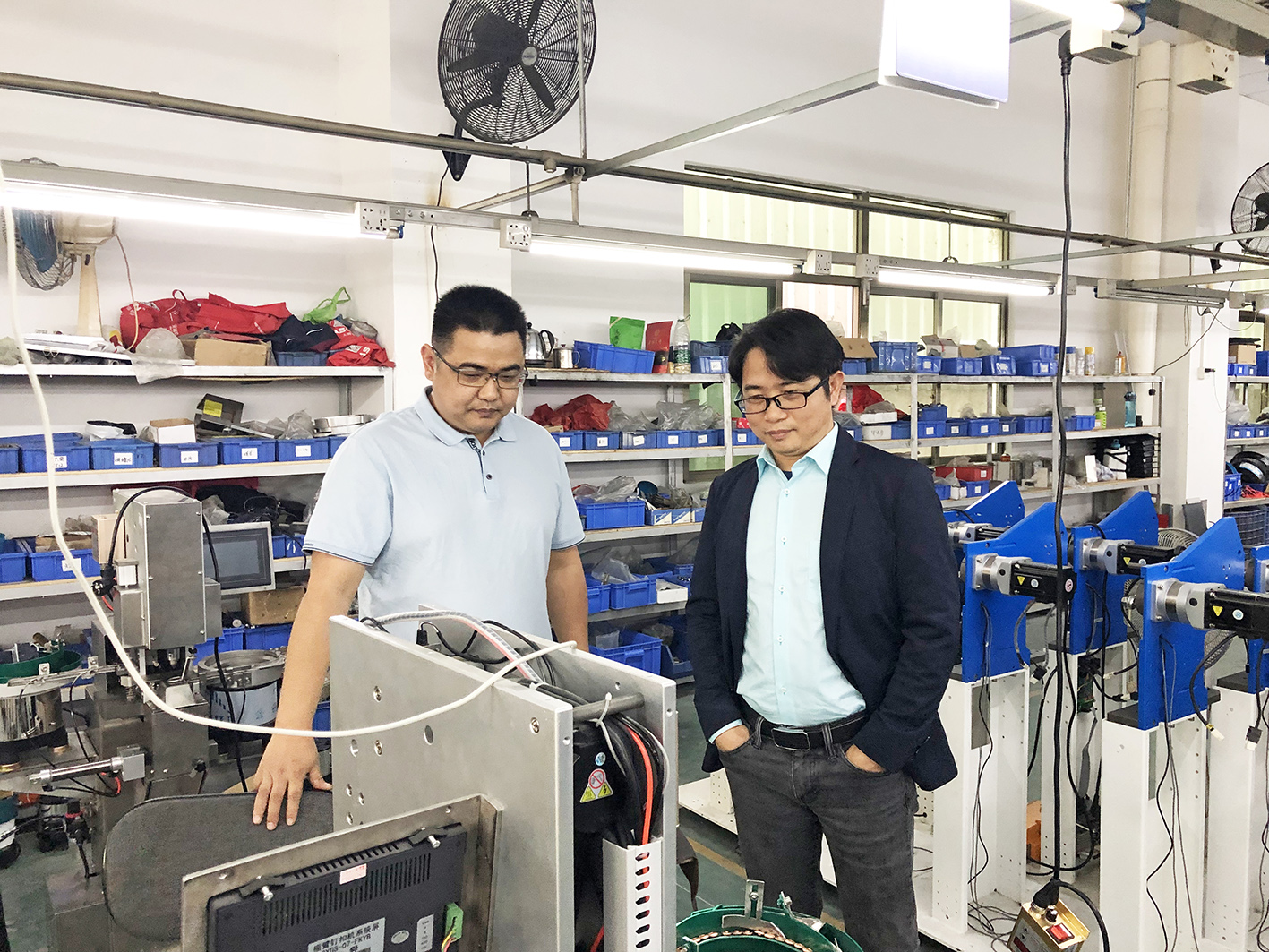 隨后,在袁總的陪同下,邵力世常務副會長來到東莞市德舜機械有限公司,與德舜公司公司總經理謝路彬以及大舜公司總經理謝金靈一同座談,了解自動釘鈕機的市場行情。隨后,在謝路彬總經理和謝金靈總經理的陪同下,大家參觀了德舜公司和大舜公司的生產車間,詳細了解兩家公司發展概況、生產經營現狀、技術創新、市場渠道拓展等方面的舉措。