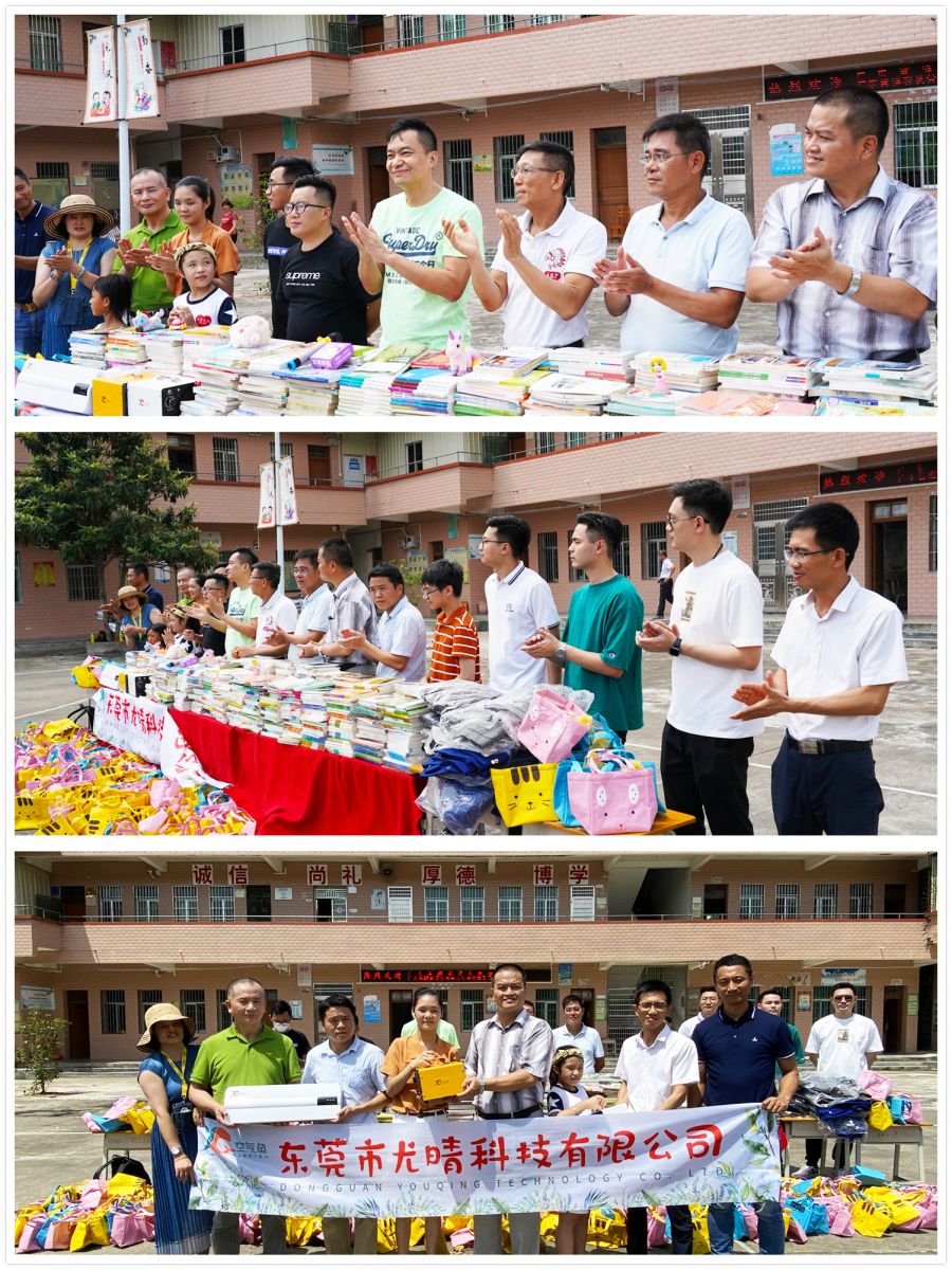 商會副會長黎偉彥和商會青年企業家委員會輪值會長陳錫文、梁俊杰、麥文豪等代表商會捐贈圖書等物資。隨后舉行了東莞尤晴公司捐贈儀式,柯文正、陳麗玲、蔡曉晴代表尤晴公司捐贈一萬多元的愛心物資。