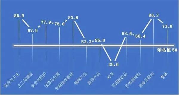 但需要注意的是,上半年行業的虧損面為18.06%,虧損企業的虧損額較上年同期增加了7.31%,盡管抗疫物資的生產帶動了行業整體效益的提升,但處于抗疫物資產業鏈之外的企業在經營上仍受到較大的影響。協會的調研結果也印證了相關數據,上半年行業的收入指數為65.6,利潤指數為61.2。其中,醫療衛生用紡織品及非織造布卷材企業的收入指數和利潤指數分別為72.0和69.5,其他領域企業的收入指數和利潤指數僅為51.2和51.7。從行業各領域的景氣度來看,醫療衛生、安全防護、過濾與分離、非織造布卷材、裝備及配件領域的景氣度較高,其中從事抗疫物資生產的醫療衛生領域的景氣指數達到85.9;而繩網、線帶、襯布等領域的景氣指數相對較低,其中襯布領域的景氣指數在榮枯值(50)以下。