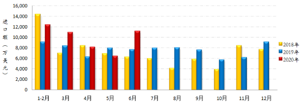 進口:據(jù)海關(guān)最新數(shù)據(jù)顯示,2020年1-6月我國縫制機械產(chǎn)品累計進口額4.87億美元,同比增長24.72%,增幅較前5月提升近5個百分點,顯示國內(nèi)市場正積極穩(wěn)步復(fù)蘇。其中工業(yè)縫紉機進口量1.9萬臺,進口額3396萬美元,同比分別下降18.99%和41.65%。