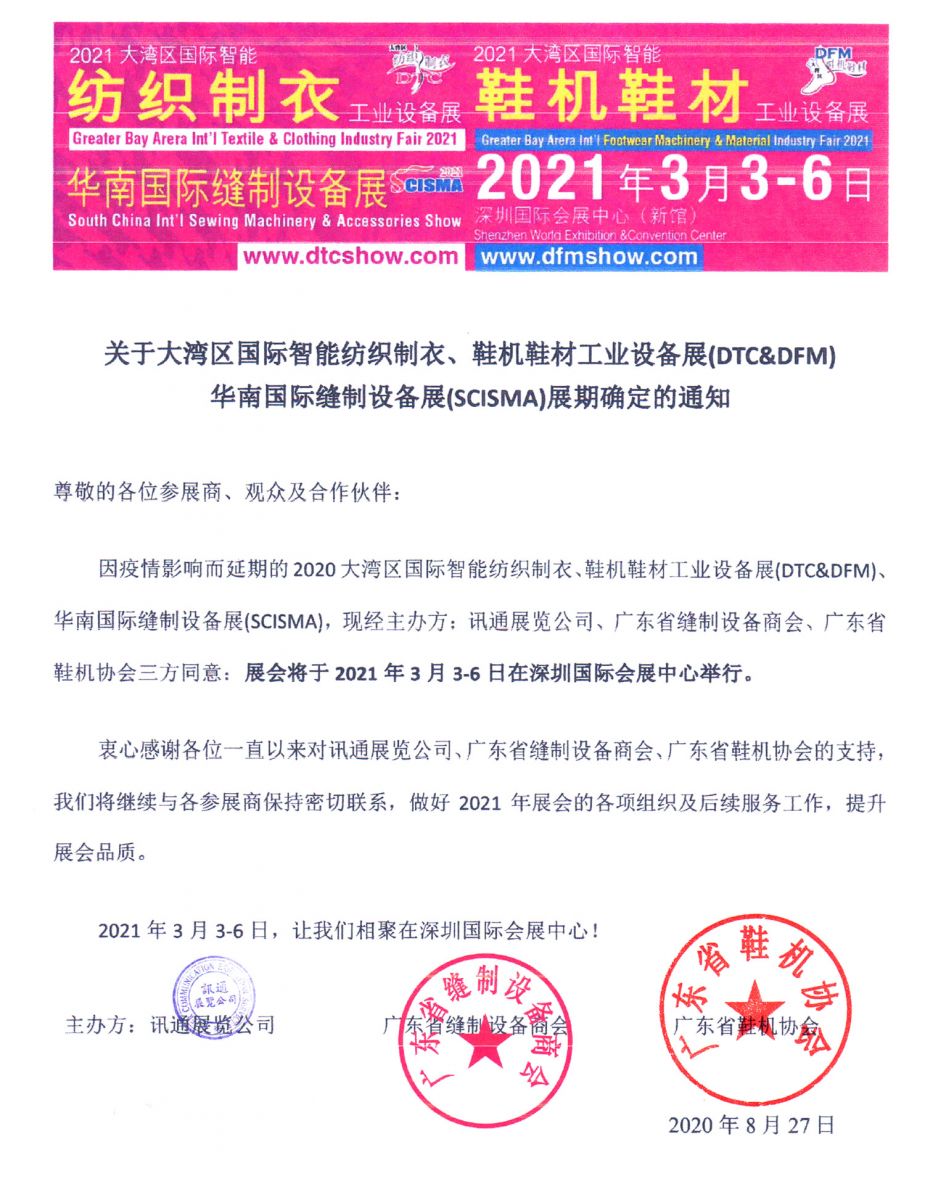 因疫情影響而延期的大灣區(qū)國際智能紡織制衣工業(yè)設(shè)備展DTC、華南國際縫制設(shè)備展SCISMA、鞋機鞋材工業(yè)設(shè)備展DFM,現(xiàn)經(jīng)主辦方:訊通展覽公司、廣東省縫制設(shè)備商會、廣東省鞋機協(xié)會三方同意:展會定于2021 年3月3-6日在深圳國際會展中心舉行。