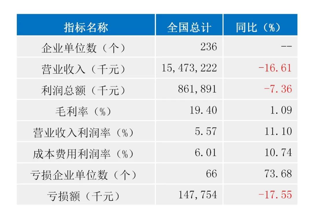 據統計局數據顯示:1-8月,行業236家規模以上生產企業累計營業收入154.73億元,同比下降16.61%,降幅較7月收窄0.57個百分點,較一季度收窄9.87個百分點;實現利潤總額8.62億元,同比下降7.36%,降幅較7月收窄9.07個百分點,較一季度收窄55.87個百分點;毛利率19.40%,同比增長1.09%;營業收入利潤率5.57%,同比增長11.10%。8月當月,規上企業營業收入環比下降5.24%,利潤總額環比增長1.68%。
