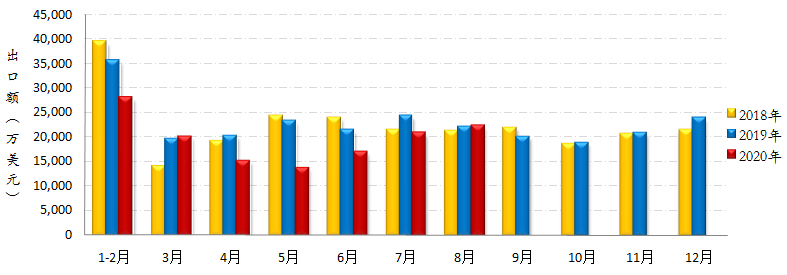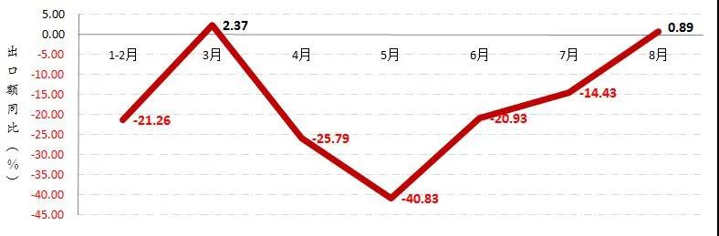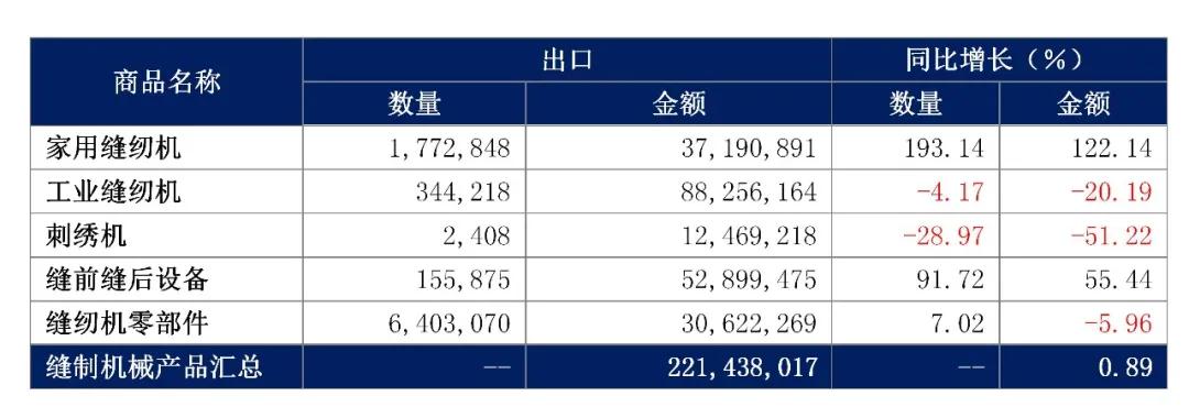 據海關總署數據顯示:1-8月我國縫制機械產品累計出口額13.62億美元,同比下降17.77%,降幅較7月收窄2.87個百分點。其中,工業縫紉機出口量209.29萬臺,出口額6.13億美元,同比分別下降22.41%和26.35%。
