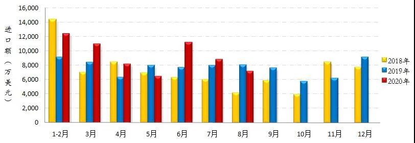 8月當月,我國縫制機械產品進口額7079萬美元,同比下降11.05%,環比下降18.96%。其中工業縫紉機進口量3106臺,進口額651萬美元,同比分別下降8.51%和12.82%,環比分別增長27.19%和17.90%。