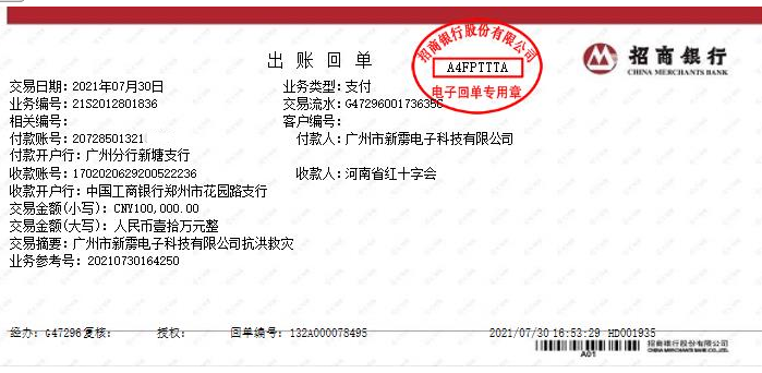 商會理事單位廣州市新靂電子科技有限公司向河南省紅十字會捐款十萬元,用于抗洪救災。為河南抗洪救災伸出援手奉獻愛心,為受災群眾恢復正常生產生活、重建家園貢獻力量。