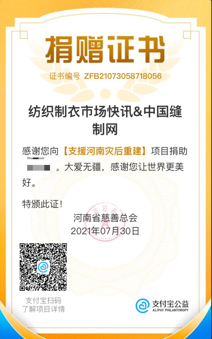 紡織制衣市場快訊/中國縫制網通過河南省慈善總會向河南災區捐款。