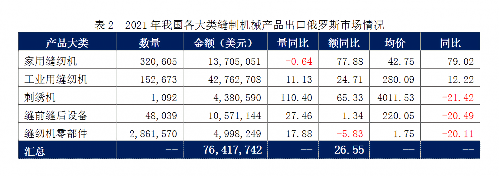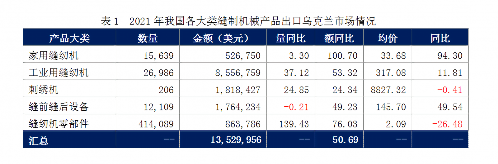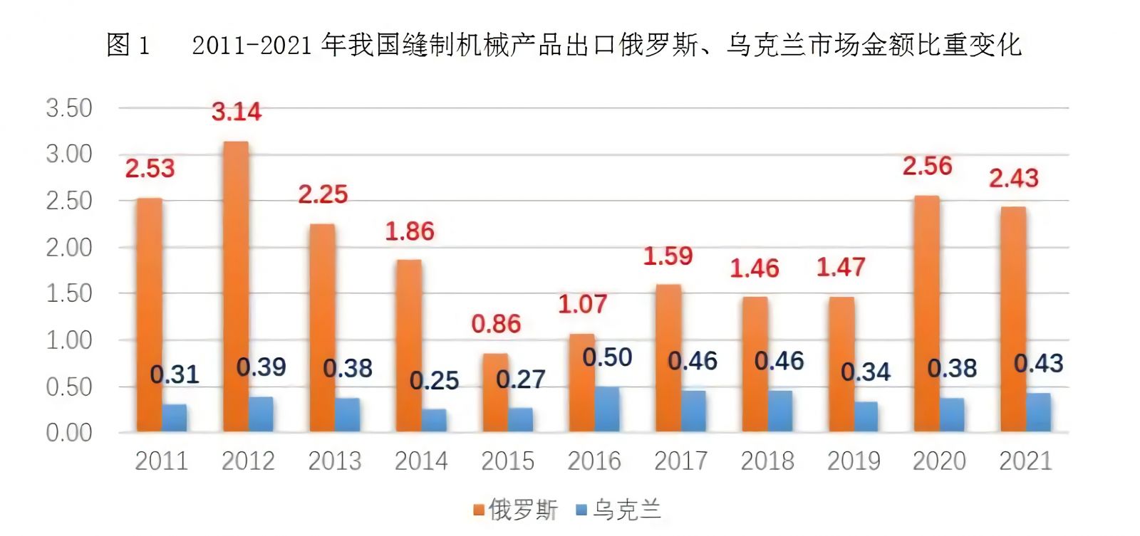 俄羅斯與烏克蘭都是共建“一帶一路” 國家,近年來隨著“一帶一路”政策的推廣與落實,我國與兩國間的貿易往來越加頻繁,2021年我國對兩國縫制機械產品出口均刷新了歷史記錄。從市場規模上看,2021年海關數據顯示(圖1),我行業出口至俄烏市場的縫制機械產品總金額為8995萬美元,約占行業出口總額的3%,而我國基本沒有從兩國進口任何縫制機械產品。