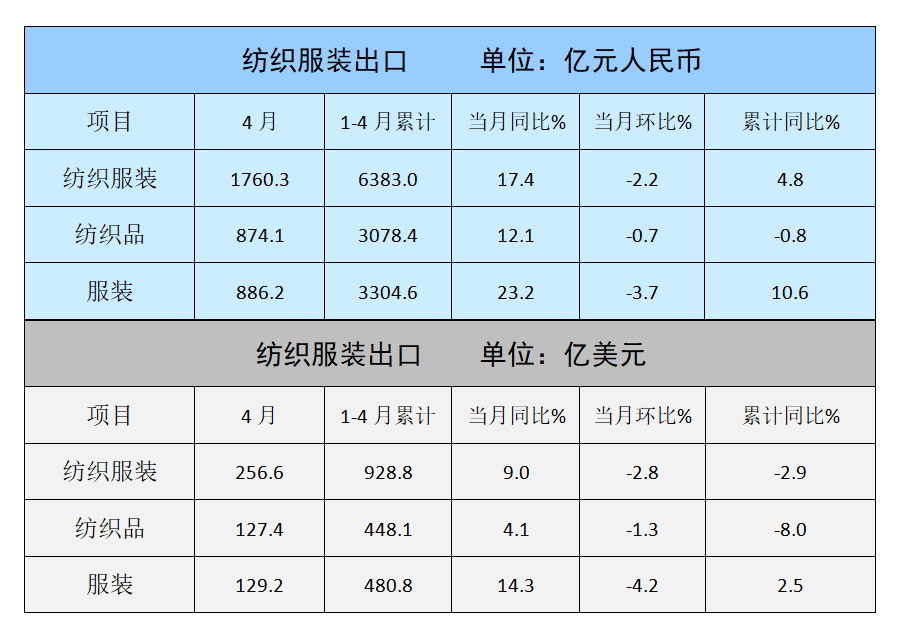 4月,紡織服裝出口1760.3億元,同比增長17.4%,環(huán)比下降2.2%,其中紡織品出口874.1億元,增長12.1%,環(huán)比下降0.7%,服裝出口886.2億元,增長23.2%,環(huán)比下降3.7%。