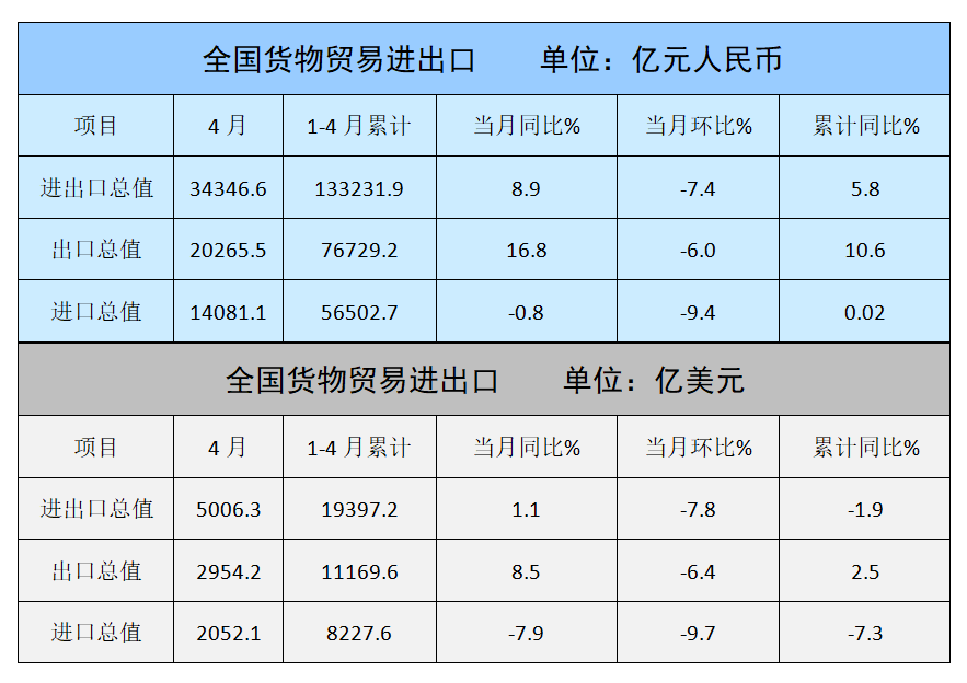 根據海關總署5月9日發(fā)布的最新數據,在我國穩(wěn)外貿政策持續(xù)發(fā)力和供應鏈恢復、訂單加快交付以及較低基數的推動下,按美元計,4月我國紡織服裝出口同比繼續(xù)保持增長,環(huán)比稍有回落。其中,服裝當月出口同比增長14.3%,帶動累計服裝出口由負轉正,紡織服裝整體出口降幅進一步收窄。