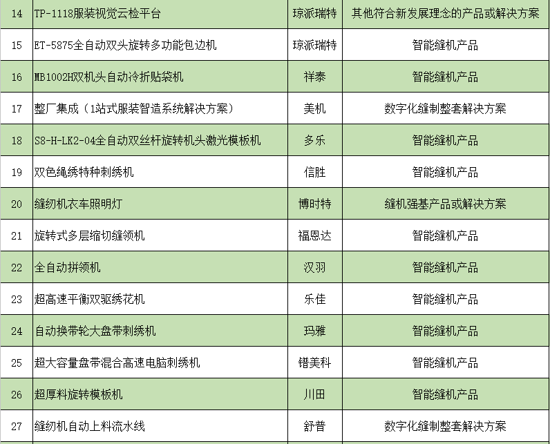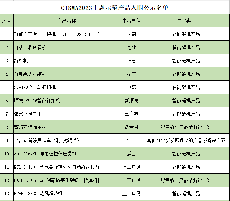 按照《CISMA2023主題示范產(chǎn)品評選辦法》規(guī)定,經(jīng)協(xié)會科技委組織專家組嚴(yán)審優(yōu)選,中國縫制機(jī)械協(xié)會理事長辦公會議審核,共有49家企業(yè)申報(bào)的68項(xiàng)參展展品成功入圍,入圍名單附后。