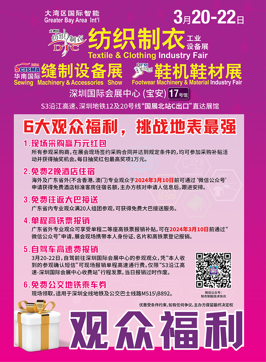 2024年3月20-22日在深圳國際會展中心17號館舉行的大灣區國際智能紡織制衣工業設備展DTC、華南國際縫制設備展SCISMA、大灣區國際智能鞋機鞋材工業設備展DFM,將展出各類先進智能縫制設備,為下游紡織服裝、箱包、鞋類等行業帶來一個了解和采購先進生產設備的絕佳平臺!展出產品包括:縫紉設備、編織機械、繡花及激光設備、印花設備、超聲波設備、數碼印花、新材料面輔料專區、電腦輔助生產設計等智能先進設備及技術,積極配合下游行業的高端及個性化生產需求。同時,推動響應綠色環保、節約能源的環保生產理念。
