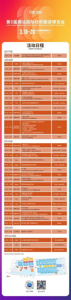 展會期間將舉辦“潮起東方5.0”開幕大秀、80+品牌發布秀、12場行業高峰論壇、3大商貿對接會、中國內褲文化節、中國居家時尚文化周等多場精彩活動,全方位呈現產業前沿趨勢與時尚潮流。預計將吸引來自全球50多個國家和地區的超14萬專業采購商到場。最全展會活動日程表公布,長按收藏!3月18-20日,行業前沿、無限商機,我們汕頭國際會展中心見!
