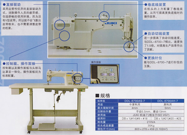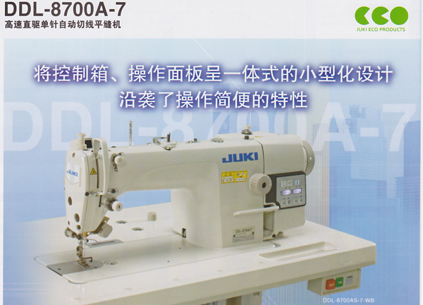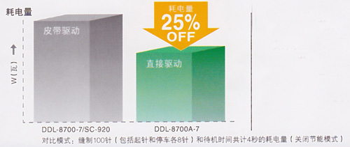 采用新型的小型伺服馬達實現直接驅動方式。該新型伺服馬達不僅節能性能優秀,同時還實現了高速化和高扭矩化。與采用皮帶驅動的DDL-8700-7相比節能25%。采用比RoHS指令等有害化學物質規則更嚴厲的JUKI綠色采購標準。