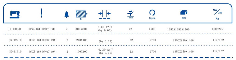 JK-T2210電子花樣機系列是一款集精密機械、氣動與電腦技術于一體的光機電一體化專用縫紉設備。具有自動停針、自動切線、自動松線、自動拔線、自動抬壓腳等功能。配備基于WINDOWS系統開發的國內最先進的專用控制系統,可通過USB接口直接導入縫紉花樣。采用高清晰觸摸屏,操作方便、直觀、真正實現傻瓜式操作。適用于縫制中厚料、皮革面料、如牛仔服、手袋、箱包、鞋面、運動器材。 技術參數: