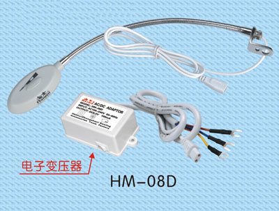 型號: HM-08D (電子變壓器) 1.功 率: 0.65W 2.輸入電壓: 交流220V, 50Hz (380V) 3.輸出電壓: 直流6.5V, 100mA 4.接線端: 電機開關 特 點: 1.省電 2.不發熱 3.輕巧 4.壽命長 5.光線柔和 6.光線可分兩級調光 7.適用于任何縫紉機和其他照明 8.可調整任何角度,使光線更清晰