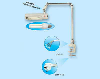 型號:HM-11、HM-11T 功率:5W-15W 電壓:220V(110V) 接線端:HM-11接電機開關,HM-11T接電源插座 用途:各種型號衣車及其它照明 特點: 1、使用2U螺旋口節能燈,可根據客戶要求配置5W~15W燈管。并且每個接頭部分都可任意調節,輕松達到最佳照明效果。 2、燈夾座可夾臺板厚度為10mm-50mm。 3、電源線長度為1800mm.