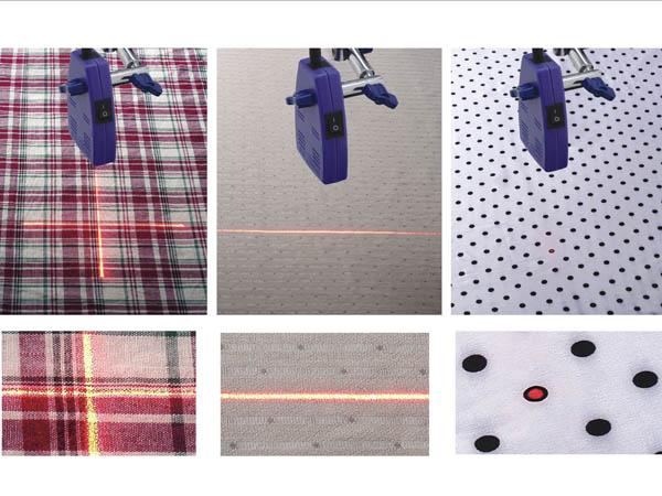 針對有特殊花樣格式之布料,在迭布時經由雷射記號標線器的照射,使得每一層不管是圓點、格 子或直線都能很準確地裁切在同一位置上。