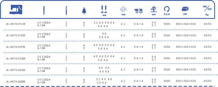JK-8670是一款沿襲了公司JK-8668系列產(chǎn)品先進功能的新型小頭繃縫機,是公司繃縫系列的高端產(chǎn)品;小頭圓周周長僅為180 mm,適合于縫制T恤的袖口、童裝袖口以及圓形小物,解決了過去不易縫紉的細小部位的縫紉,能安裝各種輔助裝置。
