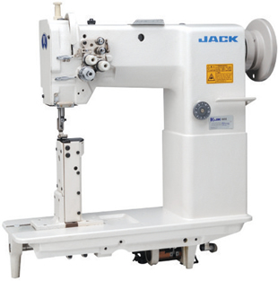 本機是杰克高臺機的系列產品采用針桿擺動與送布牙同步送料 的方式,滑桿挑線,立式旋梭勾線,形成雙線梭式線跡。上下 軸采用同步齒形帶傳動,旋鈕式針距調節裝置及杠桿式倒順縫 裝置。高度178毫米的柱式縫臺,使操作空間寬敞,回轉靈活。 特別適用于幾層不同質地材料的縫制,可防止縫料層之間的滑 移,線跡均勻美觀。