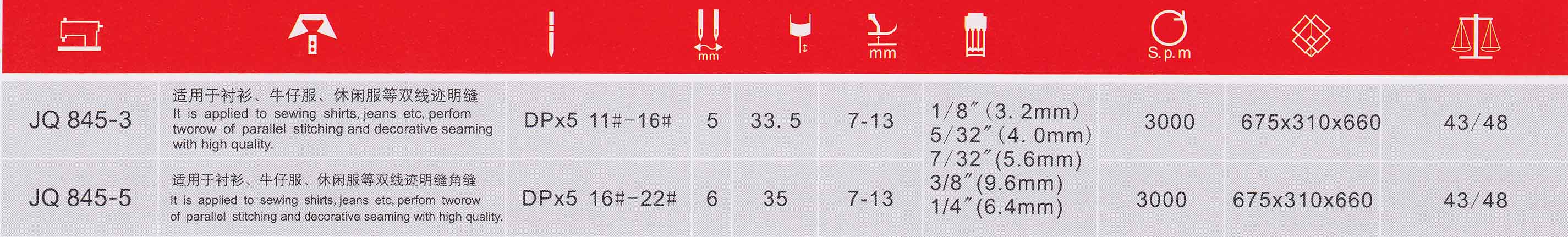 The machine have structure of twin-needle split needle bar it's very convenient to make comer seam as well.Feesing in phase needle bar and feed dog is helpful for wonder and nice stitch. against any glideof materials.Suitable for lady's underwear、jeans overcoat etc,incluing decoration and comer seam.