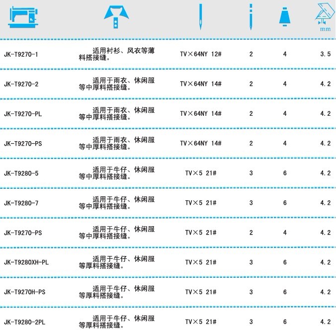 JK-T9270/9280高速曲腕機系列適用于襯衫、風衣、牛仔裝、休閑裝等薄料、中厚料、厚料、服裝加工,其懸臂筒形的特殊結構特別適合袖、褲等筒形部位的搭接縫紉。