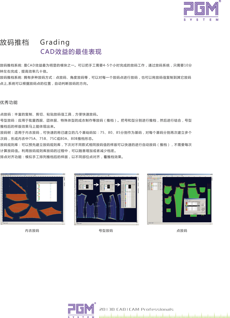 放碼推檔系統(tǒng): 是CAD效益最為明顯的模塊之一。可以把手工需要4-5個小時完成的放碼工作,通過放碼系統(tǒng),只需要10分鐘左右完成,提高效率幾十倍。 放碼推檔系統(tǒng): 擁有多種放碼方式:點放碼、角度放碼等,可以對每一個放碼點進行放碼,也可以將放碼值復(fù)制到其它放碼點上,系統(tǒng)可以根據(jù)放碼點的位置,自動判斷放碼的方向。