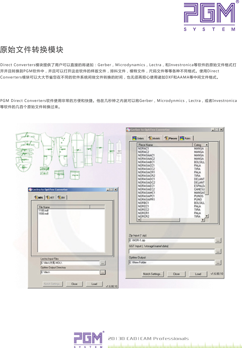 PGMDirectConverters軟件使用非常的方便和快捷。他在幾秒鐘之內就可以將Gerber,Microdynmics,Lectra,或者Investronica等軟件的幾百個原始文件轉換過來。