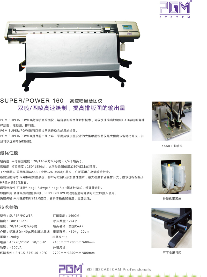 PGM POWER 最新高速噴墨繪圖儀,是在 2007 年的良好基礎上,結合最新的圖像解析技術而推出的一款繪圖儀?梢钥焖伲瑴蚀_的繪制 CAD 系統的各種樣版和排料圖。 全球化的生產趨勢,集團多工廠的生產。
