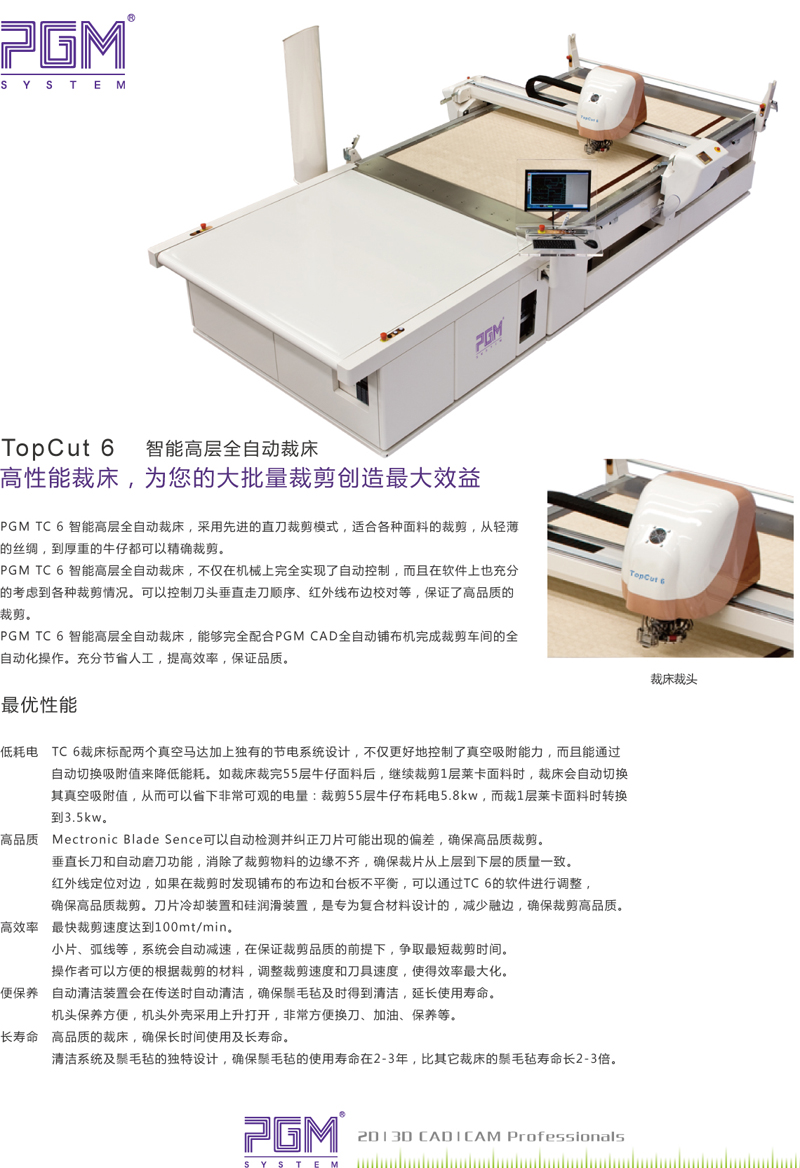 PGM TC6 全自動裁床機(jī) , 采用先進(jìn)的直刀裁剪模式 , 適合各種不同面料的裁剪 , 從輕薄的絲綢 , 到厚重的牛仔 , 從棉織品,到 PVC 等涂層面料,從服裝行業(yè),到包袋,服飾,都可以精確的裁剪。