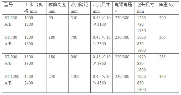 本機特點: 帶狀式裁剪機是各制衣,針織等行業的主要設備,可用于裁剪各類針織物,適用于大小范圍裁剪。ST系列帶狀式裁剪A型號為有氣墊機型。B型為變頻機型,后面無字母為無氣墊機型。 主要技術參數: