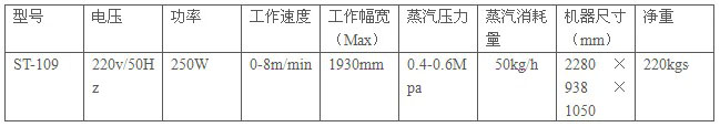 本機特點: 具有對布料預熱、蒸濕、冷卻定型全套功能,對布料進行理想預縮定型。 內置進口電子調速器,速度任意調節。 蒸盤采用不銹鋼材料制造,防止銹蝕。 采用蒸汽加熱,蒸濕,熱力集中、耗氣少、省電。 配置精密計碼器,準確記錄布匹數量。 配置萬向腳輪,移動方便。 配合人體操作高度需要,結構合理,可適應單人操作,占地面積少。 主要技術參數: