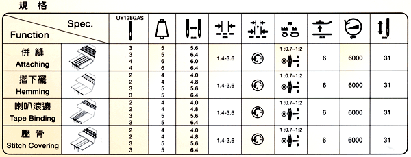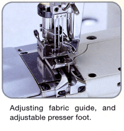 The model is our newly -developed type so called 3 in 1 - Stitch Covering, Hemming and Tape Binding combined in one machine to achieve labor cost combined in one machine to achieve labor cost saving, high quality sewing work and high productivity. (Patent No. 177529)