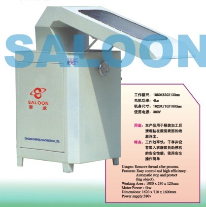 產(chǎn)品介紹: 工作箱尺:1080X530X120mm 電機(jī)功率:4kw 機(jī)身尺寸:1620X710X1600mm 使用電源:380V 用途:本產(chǎn)品用于服裝加工后清理粘在服裝表面的線屑浮塵。 特點(diǎn):工作效率快,干凈并設(shè)有吸入衣服即自動停機(jī)的安全性能, 使用安全操作簡單。