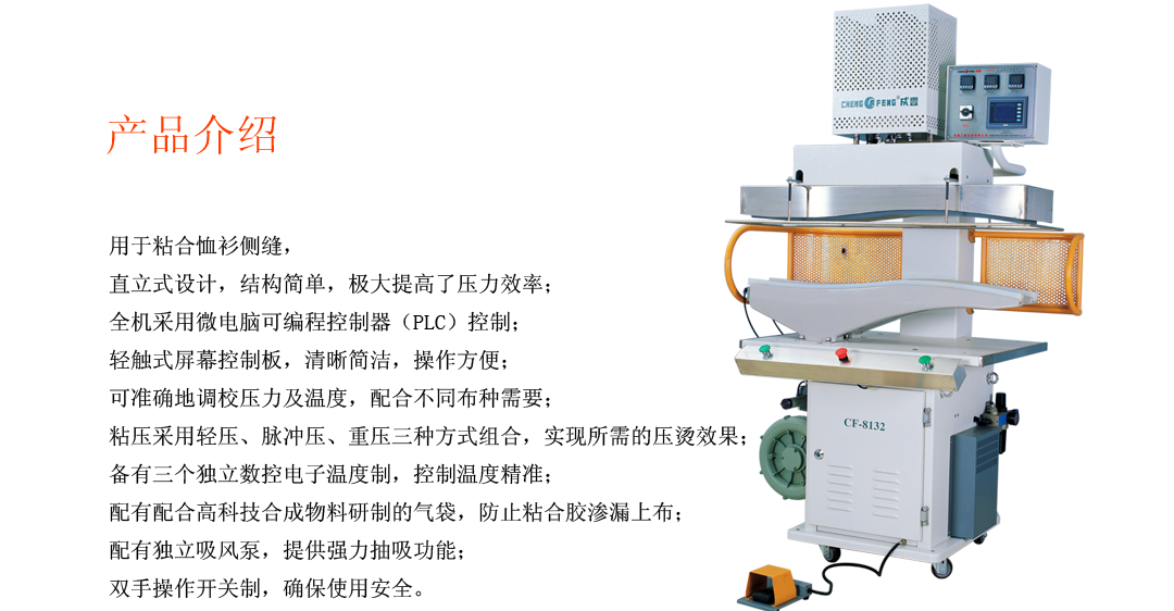熱門產品: CF-128A 高速自動拼接橡筋機   CF-126B 全自動橡筋切帶機   CF-120H 全自動切斷機(熱刀)   CF—8133 全自動(襯衣)恤衫筒粘合壓平機   CF-600FP 氣壓式雙壓棍熱熔粘合機