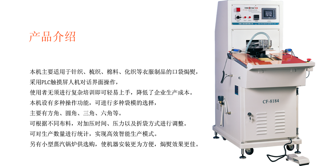熱門產品: CF-128A 高速自動拼接橡筋機   CF-126B 全自動橡筋切帶機   CF-120H 全自動切斷機(熱刀)   CF—8133 全自動(襯衣)恤衫筒粘合壓平機   CF-600FP 氣壓式雙壓棍熱熔粘合機