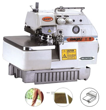 該機型在針板前方沒有收空線環裝置,可將空線環包入包縫線內,減少套結工序,并裝有松機針線裝置,在抬壓腳時可同時松開二根機針線,適用于內褲,T恤衫等。