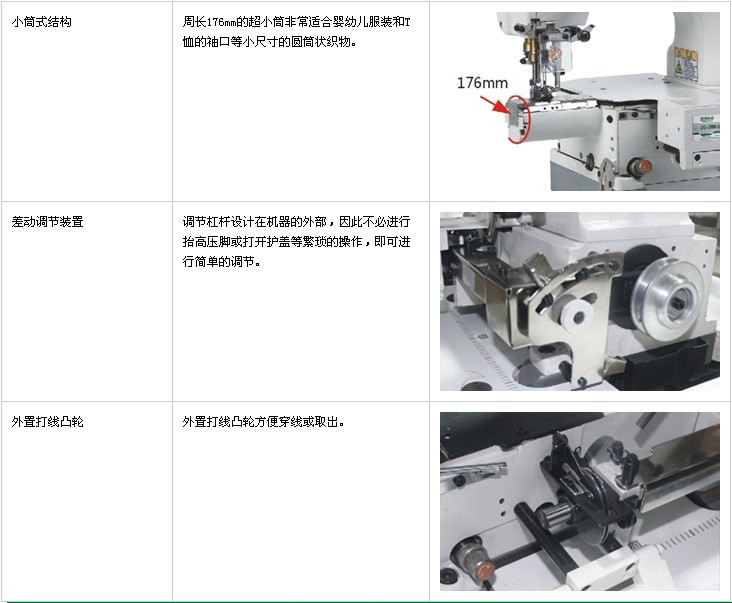 該機可進行兩面裝飾縫,是超小筒式結構,適用于嬰幼兒服裝和T 恤的袖口等裝飾縫,并可以配備切線裝置,可實現自動剪線和抬壓腳功能,可以輕松地進行一次性縫制。