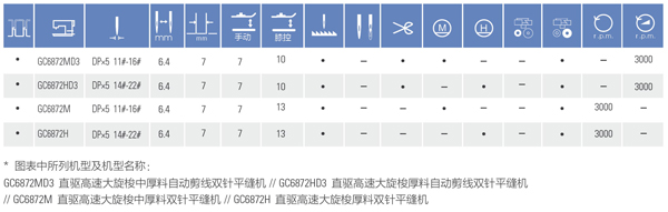 GC6872系列直驅(qū)高速大旋梭雙針平縫機(jī) 該機(jī)機(jī)針與送布牙同步送料方式防止布料起皺與滑移,旋鈕式調(diào)節(jié)針距和杠桿式倒送料機(jī)構(gòu),操作方便;適用于縫制襯衣、內(nèi)衣、制服、牛仔衣褲、大衣等,線跡整齊美觀。針間距特殊規(guī)格:3.2/4.0/4.8/6.4/7.9/9.5/11.1/12.7/15.9/25.4/31.8/38.1