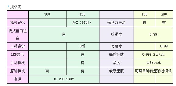 MC/E8U通過設定每段的松緊度及針數,能自動連續縫制八段不同工藝要求的工序。有26組模式記憶,每段有八段可供選擇的松緊度,而且模式之間可由適用者自由組合,以滿足多于八段工序的要求。制衣成品質量穩定,效果優良。該機結構合理,設計先進,造型美觀,操作方便,是內衣生產廠家的優選的高檔服裝設備