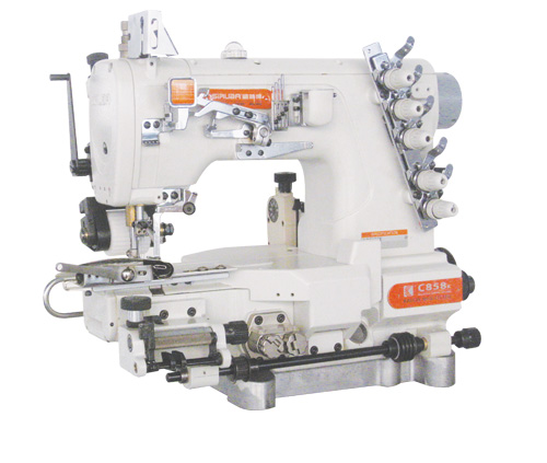 經由齒輪控制箱之控制,能有效控制松緊帶之松緊度,配合三折或二折折布喇叭及松緊帶壓縫,可精確完美的進行短褲,內褲等褲腳及褲頭之松緊帶折縫。